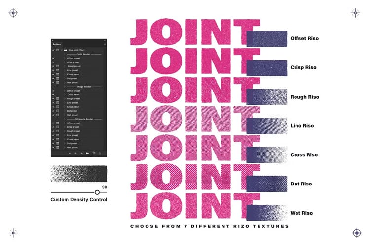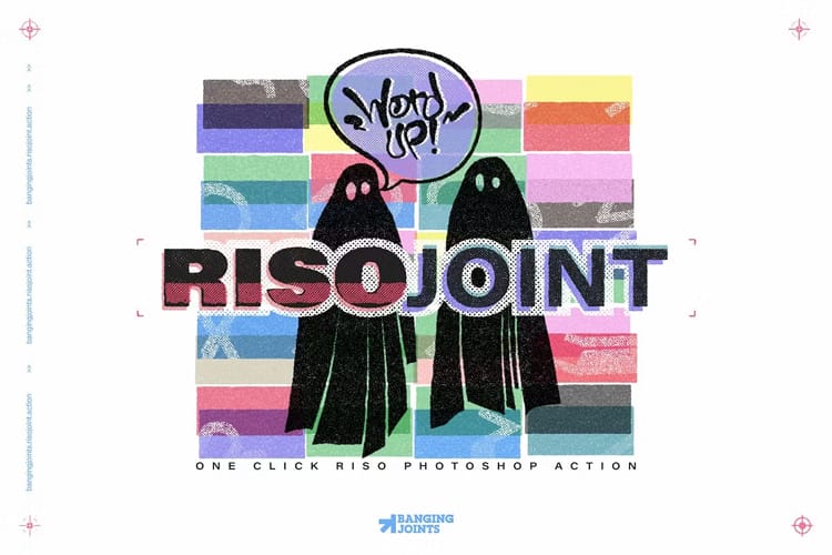 今天给大家分享PS复古涂鸦喷漆丝网印刷噪点磨损半色调特效ATN动作(RisoJoint Effect Action),轻松打造出兼具复古氛围与艺术感的视觉效果,适用于海报设计、文创产品图案等场景。